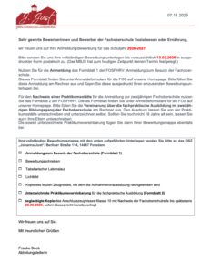 Nutzen für die Anmeldung das Formblatt 1 der FOSFHRV: Anmeldung zum Besuch der Fachoberschule. Dieses Formblatt findest Du oben auf der Seite. Bitte fülle diese Anmeldung am Rechner aus und füge dieses ausgedruckt deinen einzusenden Bewerbungsunterlagen bei.
