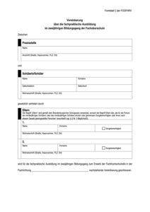 Für den Nachweis einer Praktikumsstätte für die Anmeldung zur zweijährigen Fachoberschule nutze das Formblatt 2 der FOSFHRV. Dieses Formblatt findest Du ebenfalls oben. Bitte fülle die Vereinbarung über die fachpraktische Ausbildung im zweijährigen Bildungsgang der Fachoberschule am Rechner aus. Den Ausdruck lass von der Praktikumsstätte unterschreiben und unterzeichne diesen selbst. Solltest Du noch nicht 18 Jahre alt sein, lass diese Vereinbarung auch von deinen Eltern unterschreiben. Die soweit unterzeichnete Praktikumsvereinbarung fügen dann deiner Bewerbungsmappe ebenfalls bei.